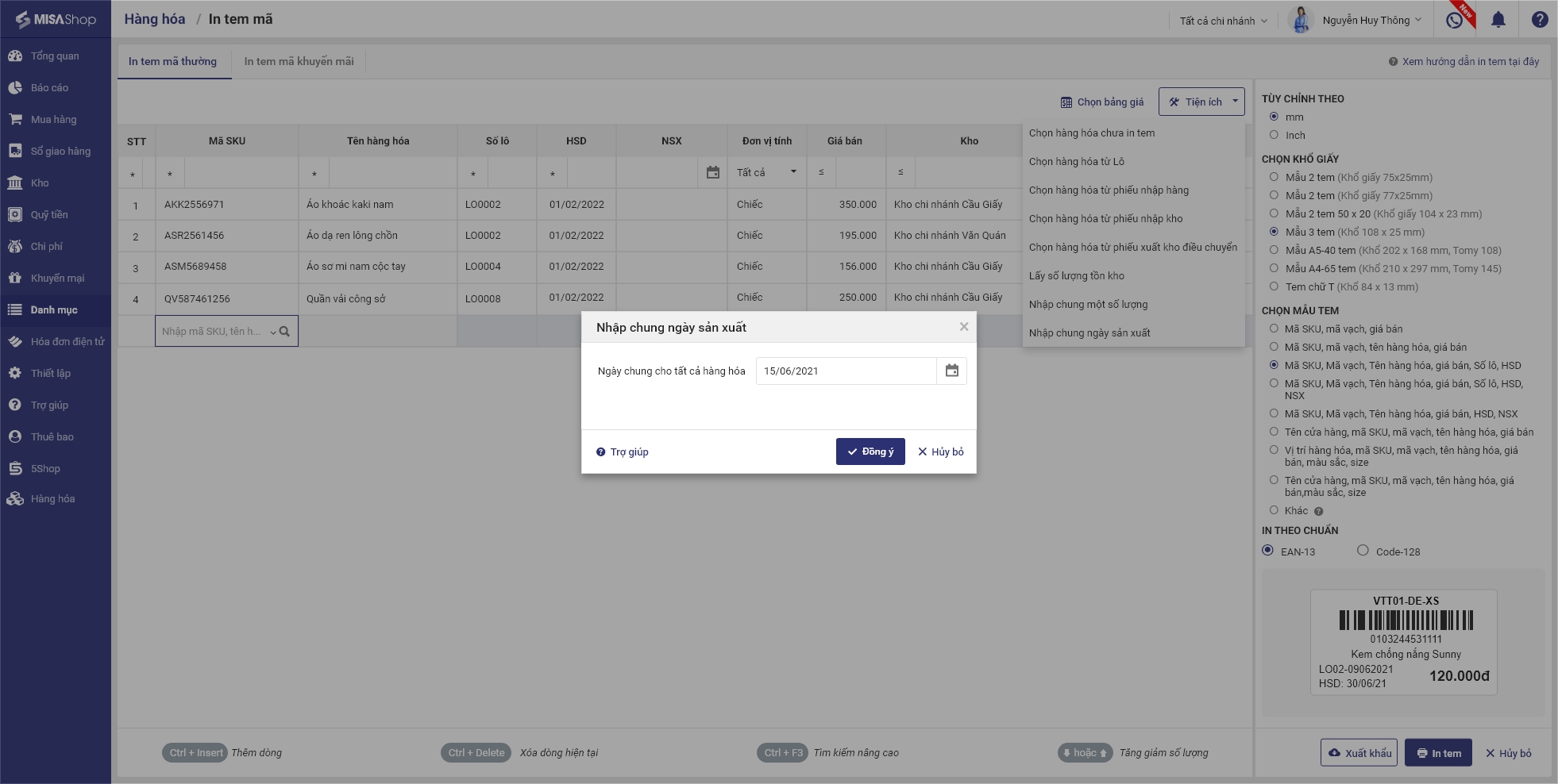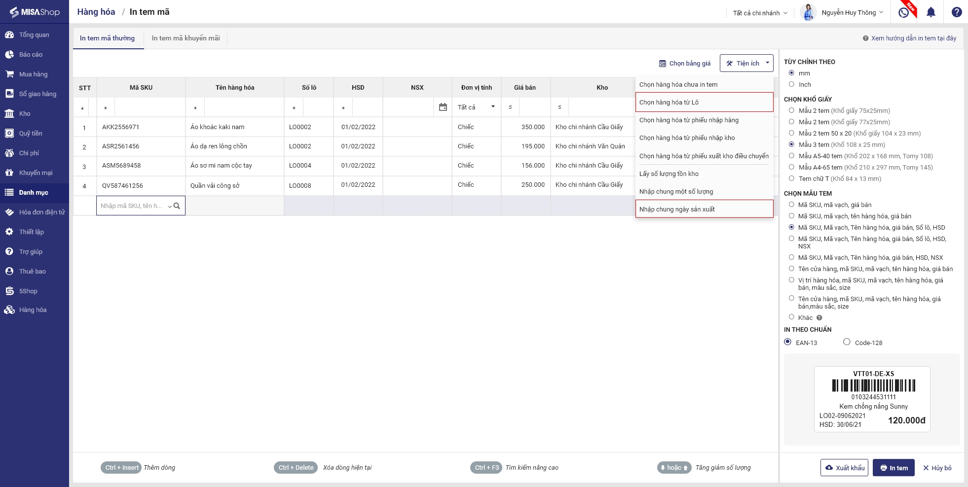 Hoặc nhấn vào Tiện ích, chọn in tem theo Lô/Nhập chung ngày sản xuất
