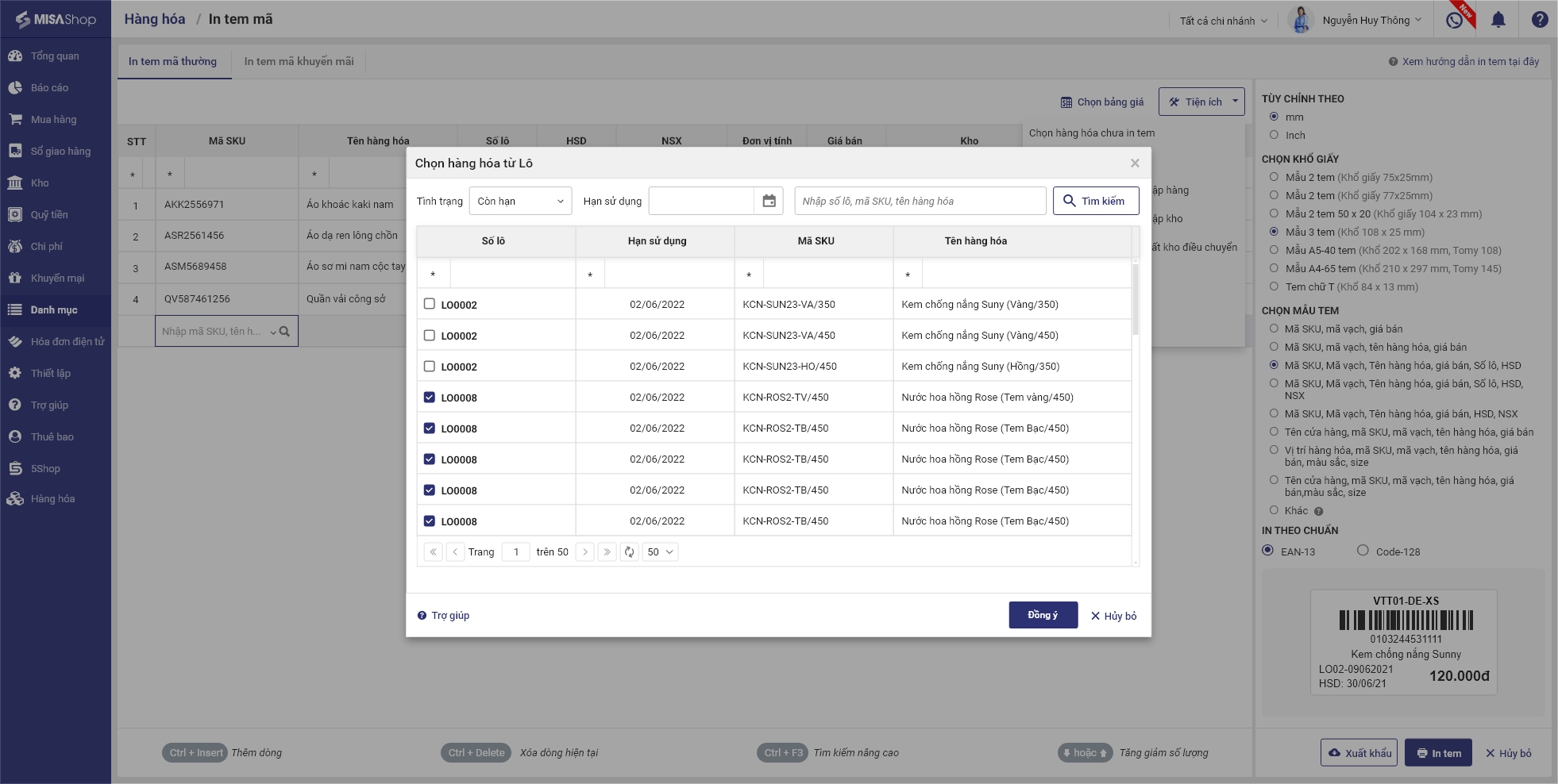 • Nếu chọn hàng hóa từ Lô, tích chọn những hàng hóa cần in tem.