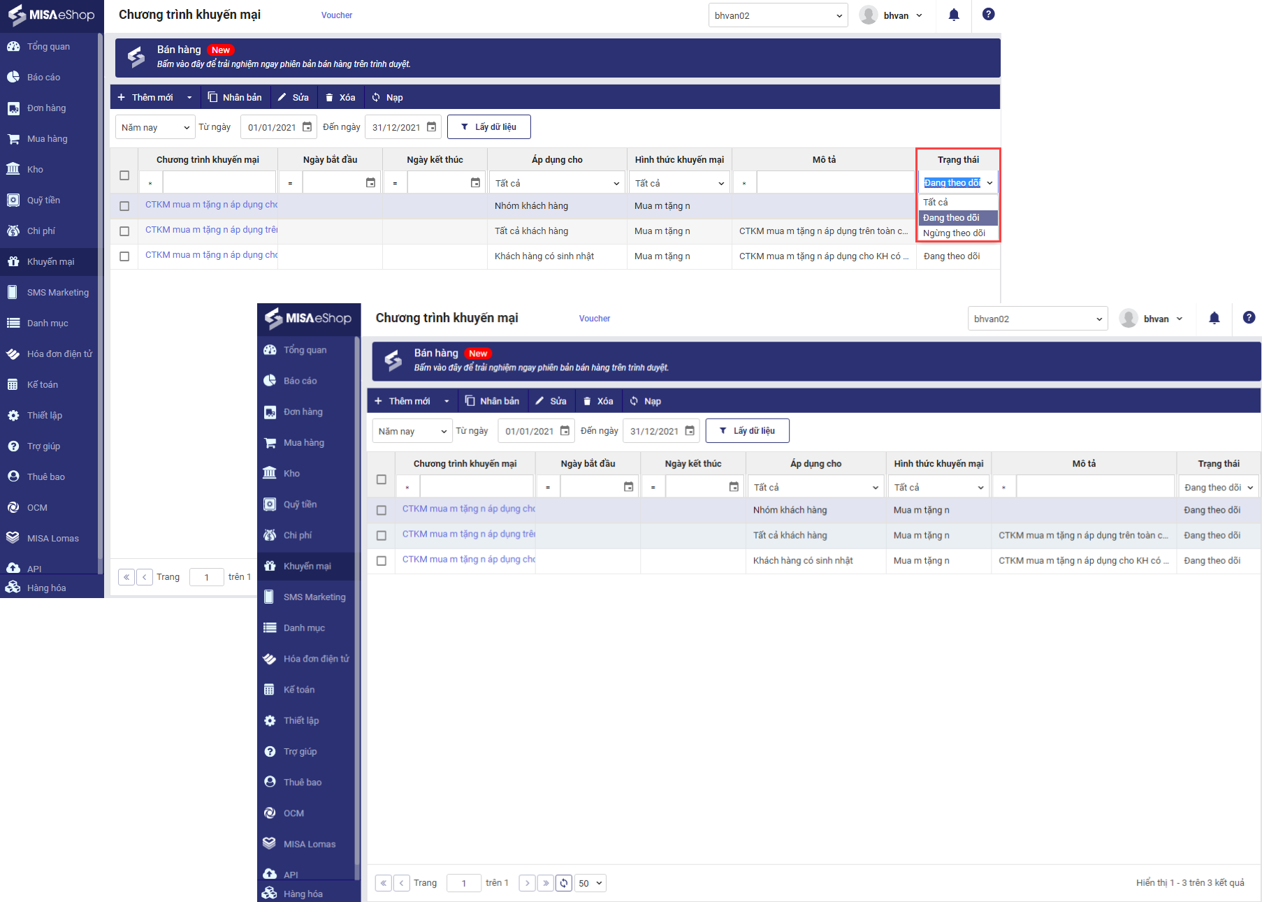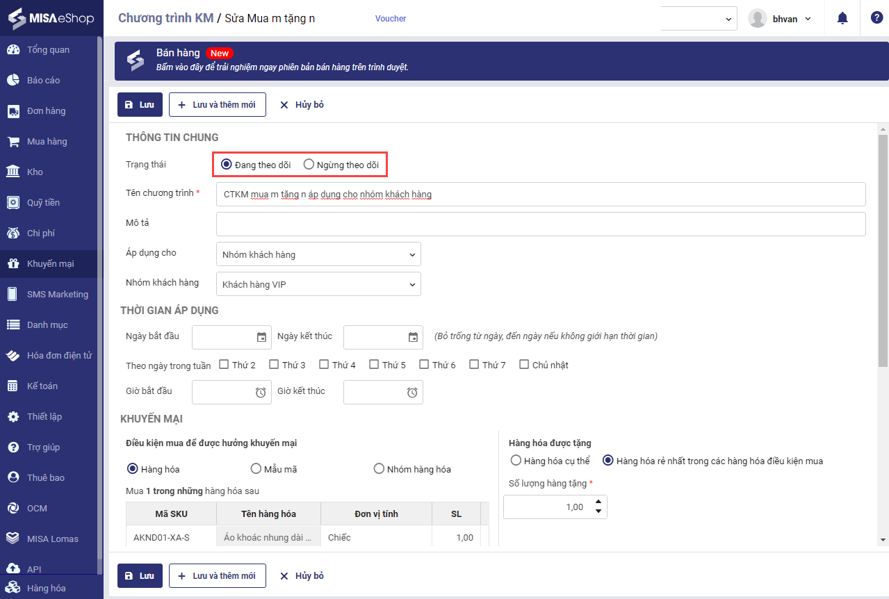 3. Trên danh sách chương trình khuyến mại, cửa hàng có thể thiết lập ngừng theo dõi những chương trình khuyến mại cũ và lọc các khuyến mại đang chạy dễ dàng hơn
