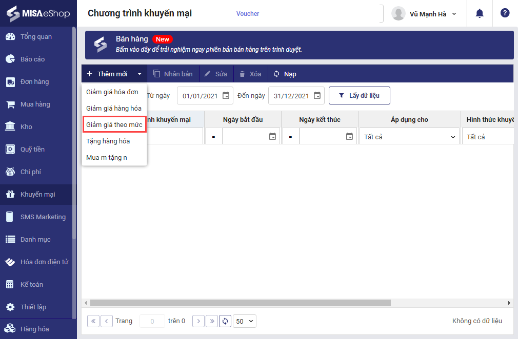 Bước 1: Trên trang quản lý, chọn Khuyến mại\Giảm giá theo mức