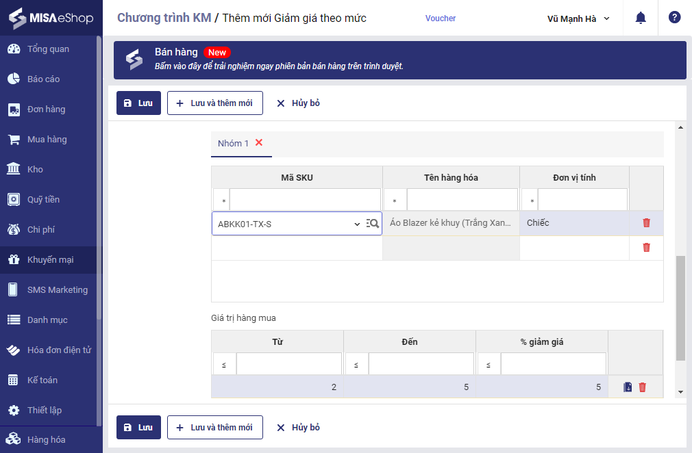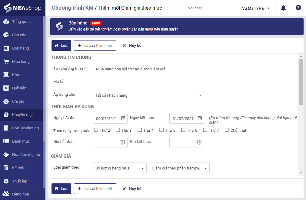 6. Bổ sung chương trình khuyến mại Giảm giá theo mức