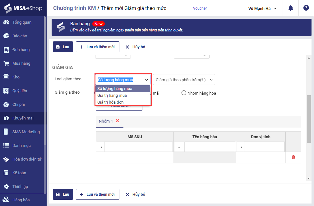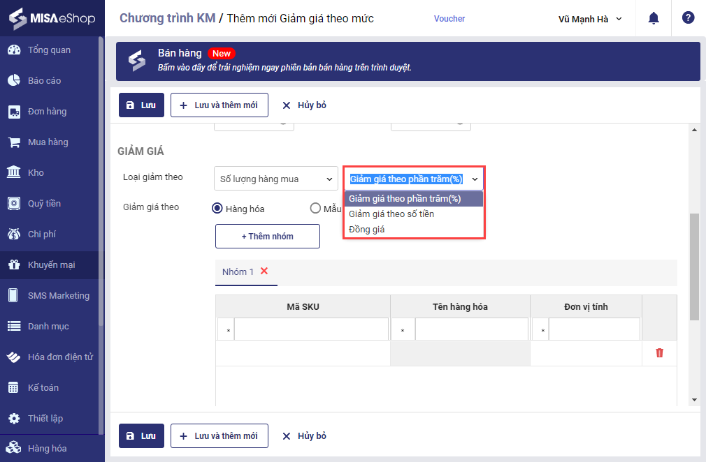 • Chọn hình thức giảm giá: Giảm giá theo phần trăm (%)/Giảm giá theo số tiền/Đồng giá