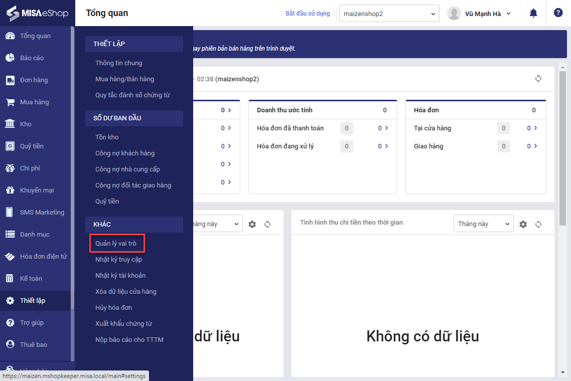 Bước 1: Trên trang quản lý, chọn Thiết lập\Quản lý vai trò.