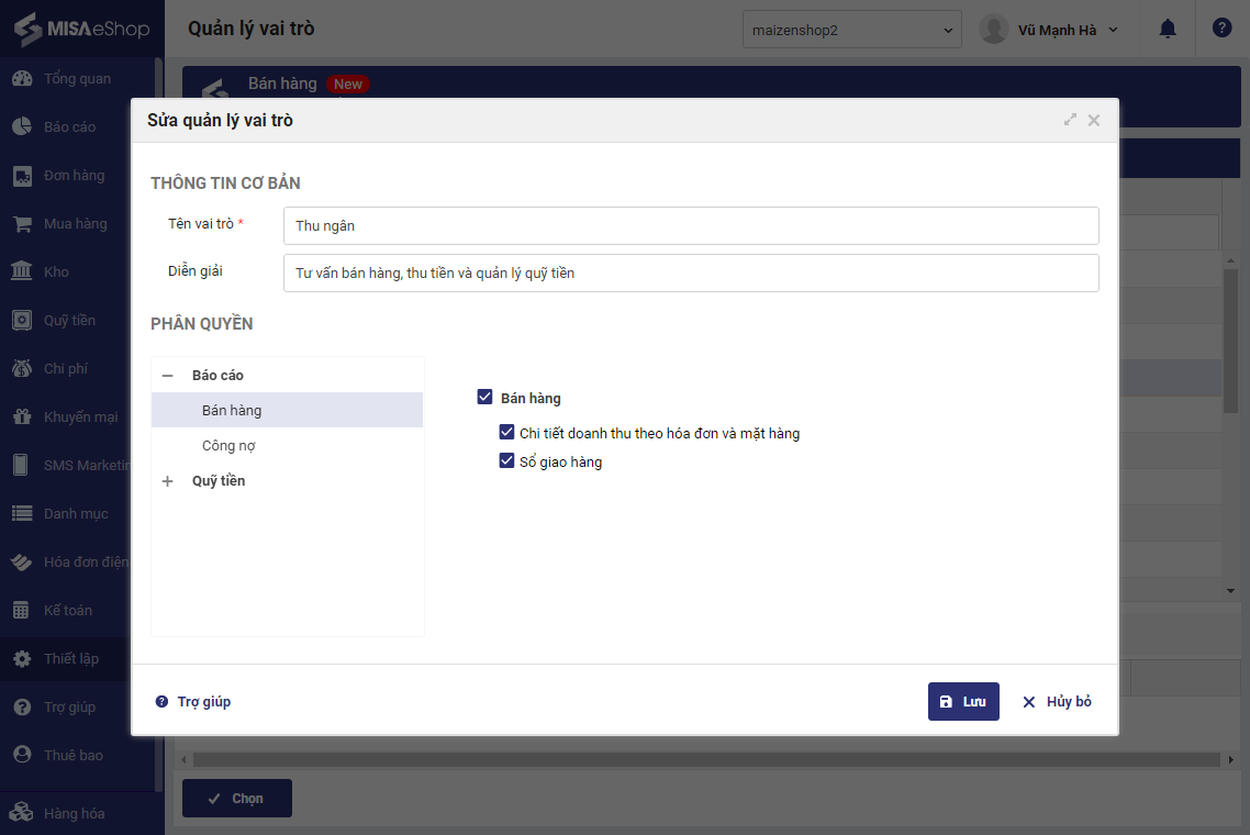 Bước 3: Tích chọn những Báo cáo cho phép Nhân viên bán hàng/Thu ngân theo dõi.