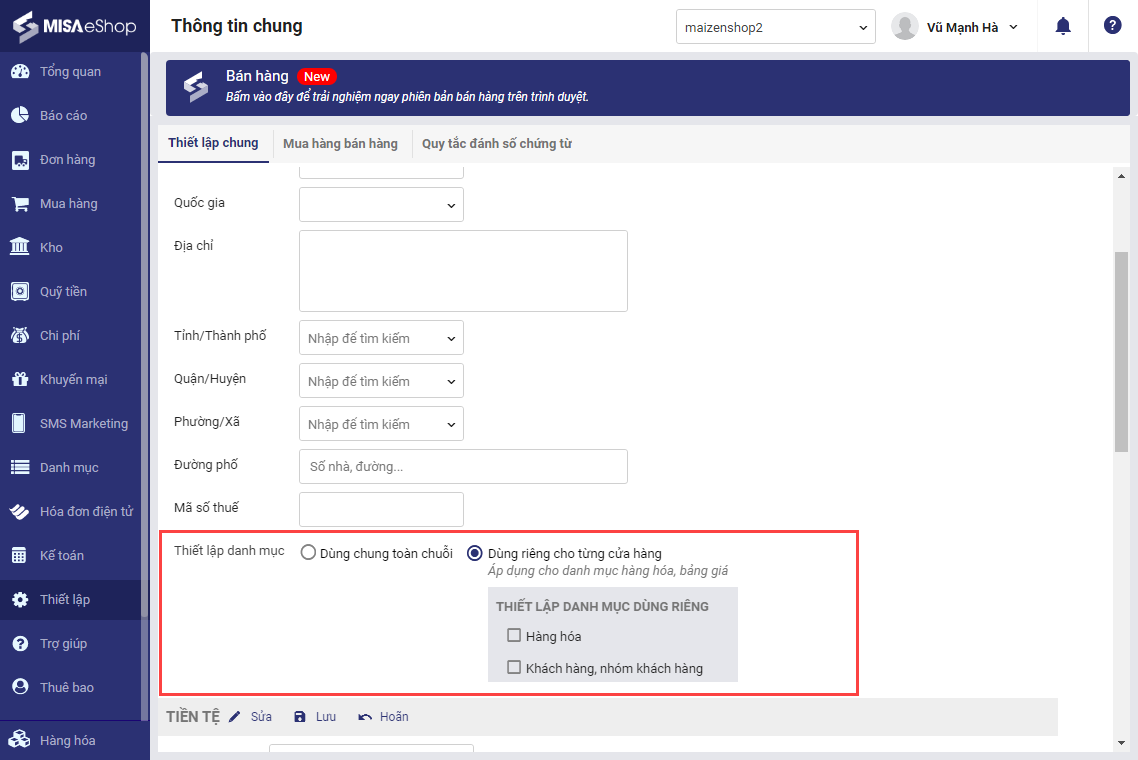 Bước 2: Cửa hàng có thể tích chọn Dùng chung danh mục/Dùng riêng danh mục.
