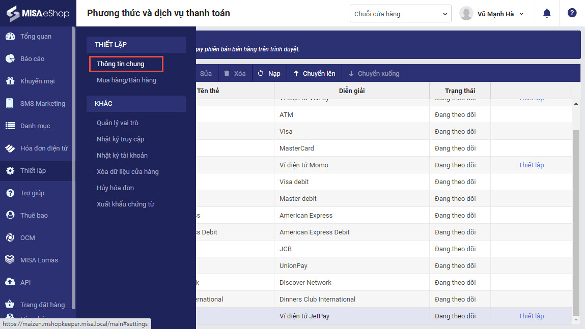 Bước 1: Trên trang quản lý, chọn Chuỗi nhà hàng, nhấn Thiết lập\Thông tin chung.