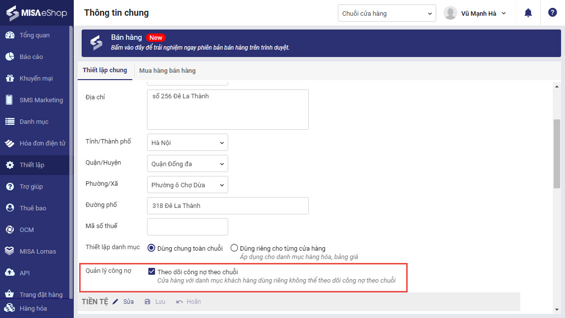 Lưu ý: Với những cửa hàng thiết lập danh mục dùng riêng không thể theo dõi công nợ theo chuỗi