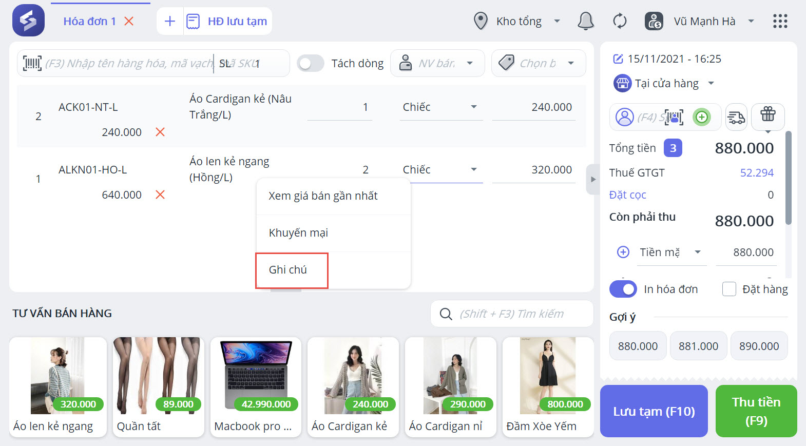 2. Khi lập đơn hàng, thu ngân có thể ghi chú cho từng hàng hoá