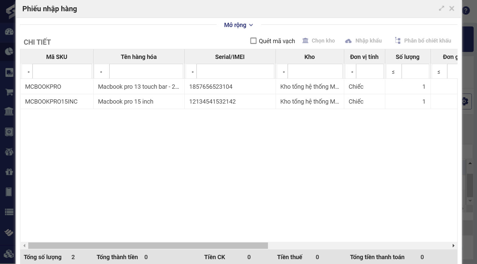 Khi nhấn vào chi tiết phiếu nhập kho, quản lý/kế toán cửa hàng có thể theo dõi thông tin Serial/IMEI của từng hàng hóa