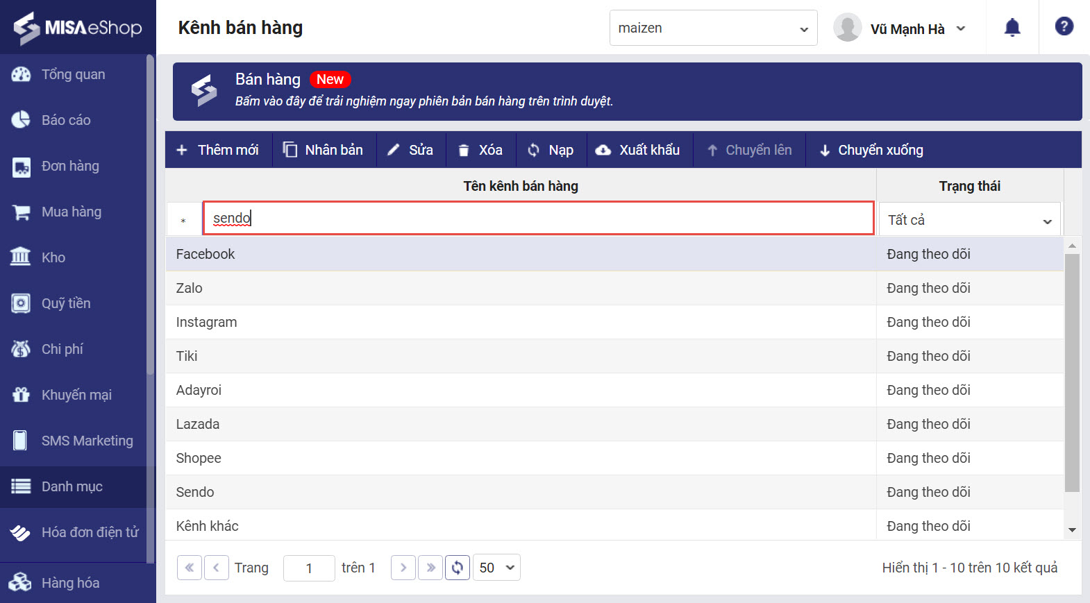 6. Kế toán có thể tìm kiếm và xuất khẩu danh sách kênh bán hàng