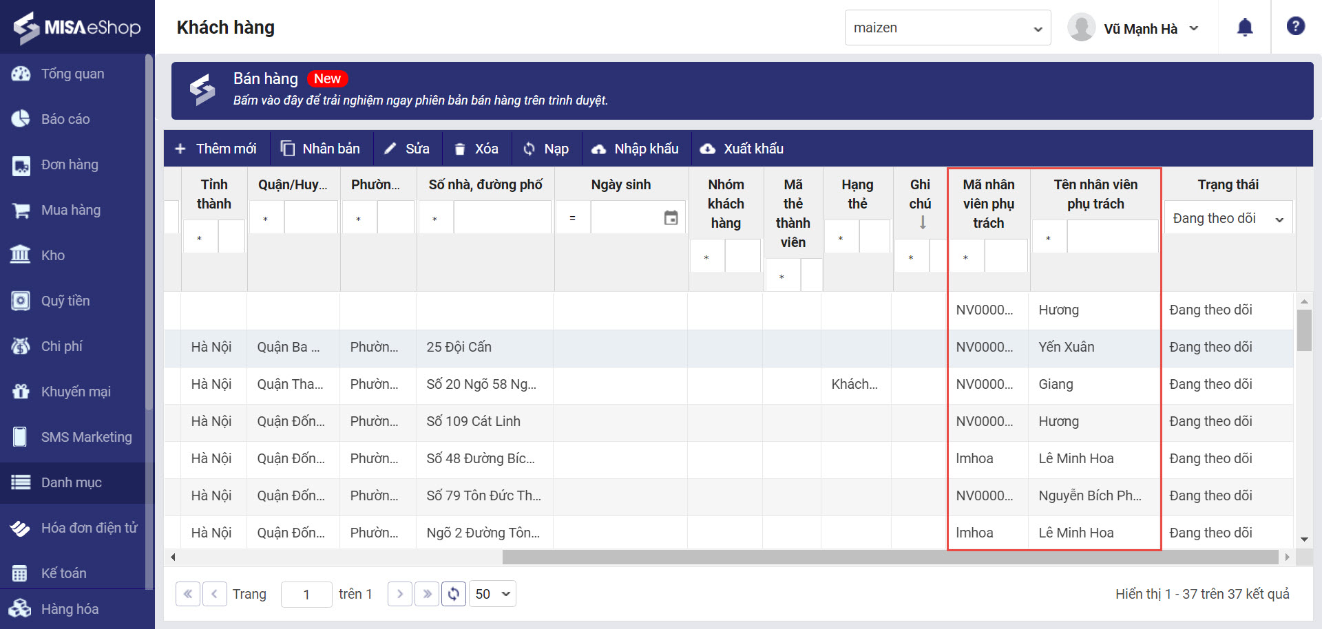 - Trên trang quản lý, danh mục khách hàng, chương trình hiển thị danh sách chi tiết nhân viên phụ trách