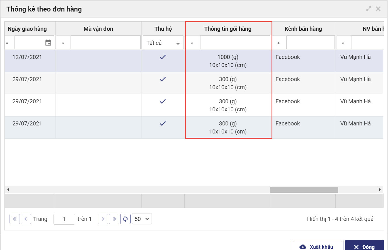 Trên trang quản lý, phân hệ Đơn hàng\Thống kê đơn hàng, quản lý có thể theo dõi trọng lượng chi tiết của từng gói hàng để điều phối xe giao hàng phù hợp