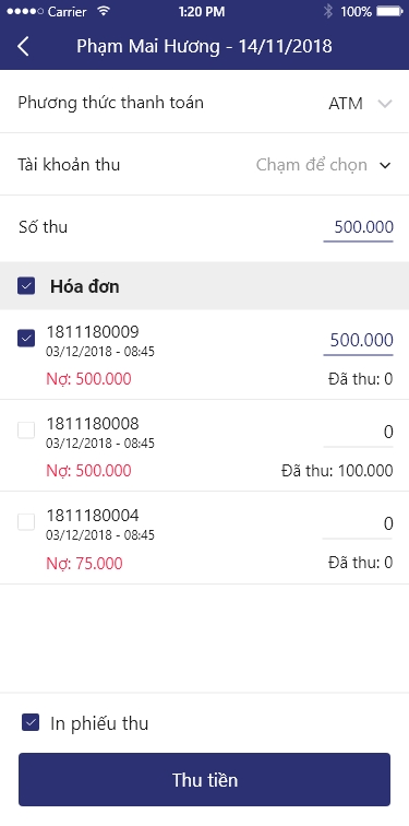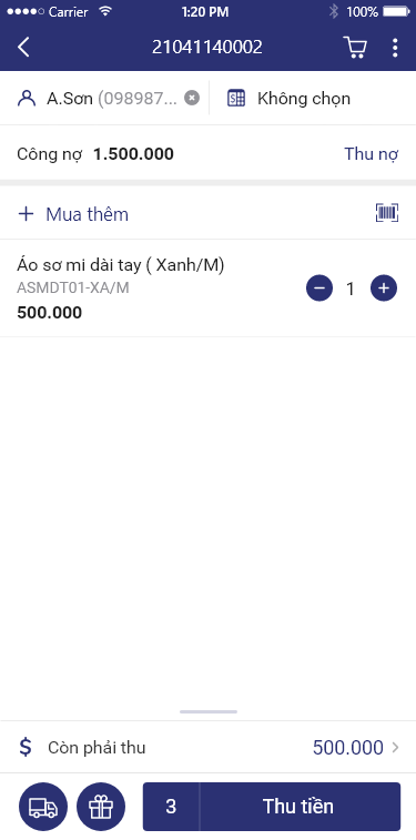 Bước 2: Thu ngân có thể nhấn vào Thu nợ để xem danh sách công nợ của khách hàng