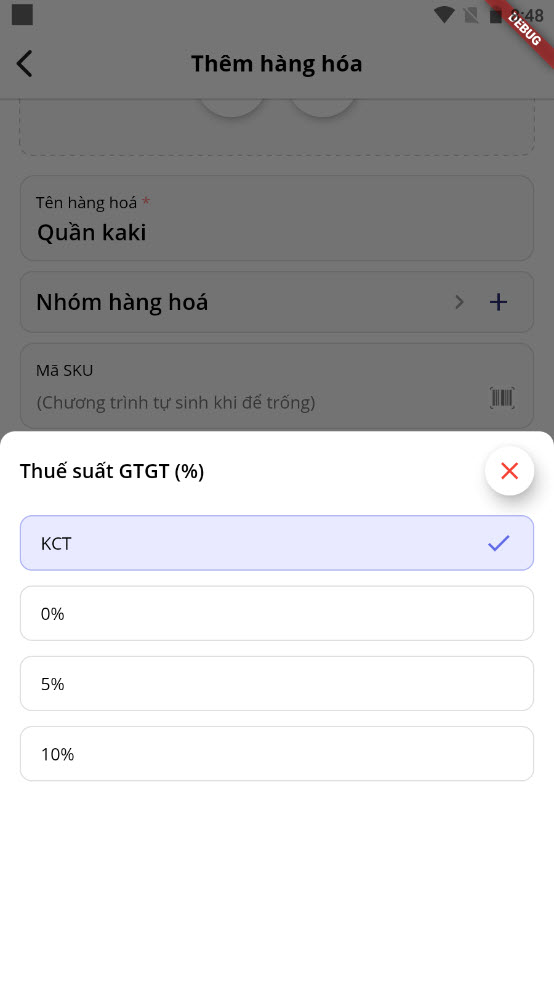 - Trên app quản lý, khi thêm hàng hóa mới, sau khi thiết lập thông tin chung của hàng hóa, thu ngân lựa chọn hình thức chịu thuế của hàng hóa đó tại mục Thuế suất GTGT. Tại đây, cửa hàng có thể lựa chọn mức thuế suất: KCT, 0%, 5%, 10%