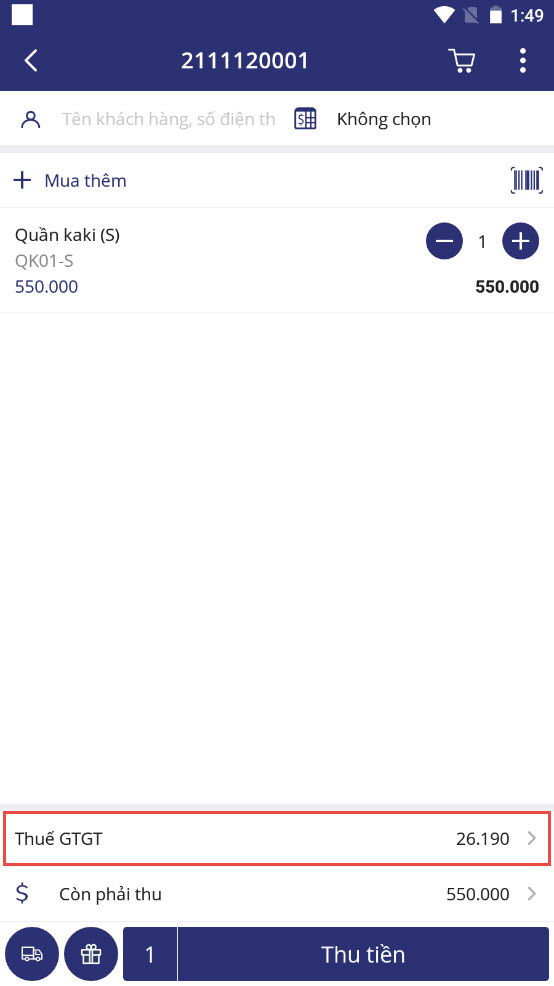 - Trên app bán hàng, khi thu ngân tạo đơn cho khách, thu ngân có thể theo dõi tiền thuế tại mục thuế GTGT