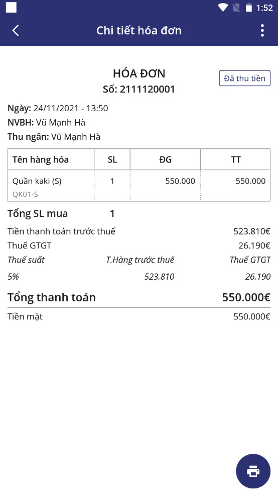 - Ngoài ra, thu ngân có thể theo dõi tiền thuế đã thu tại mục Danh sách hóa đơn\Chi tiết hóa đơn