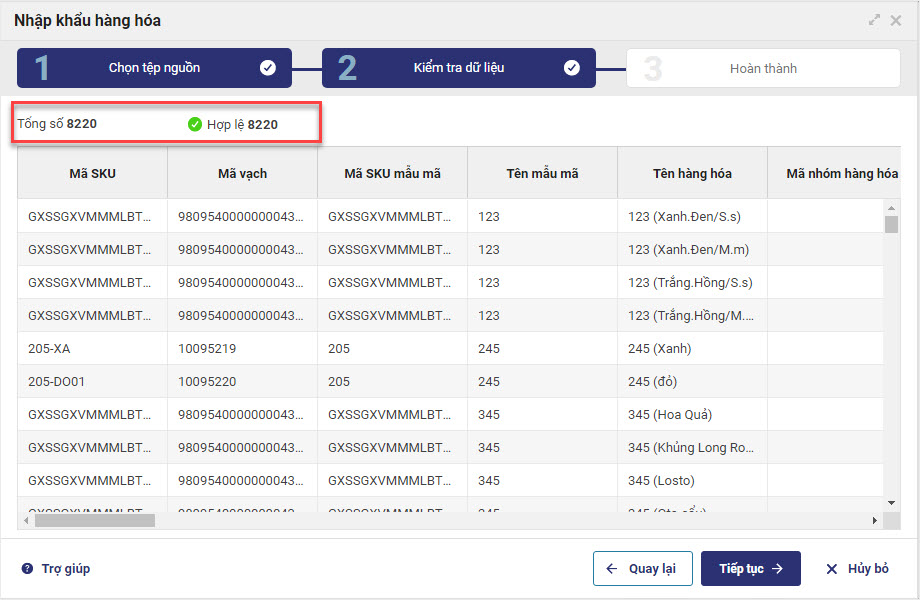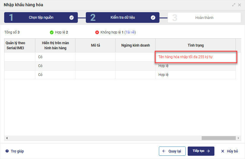 Cảnh báo khi nhập khẩu hàng hóa từ file dữ liệu khi tên hàng vượt quá 255 ký tự giúp người dùng nhận biết và sửa lỗi trước khi dữ liệu được nhập vào hệ thống