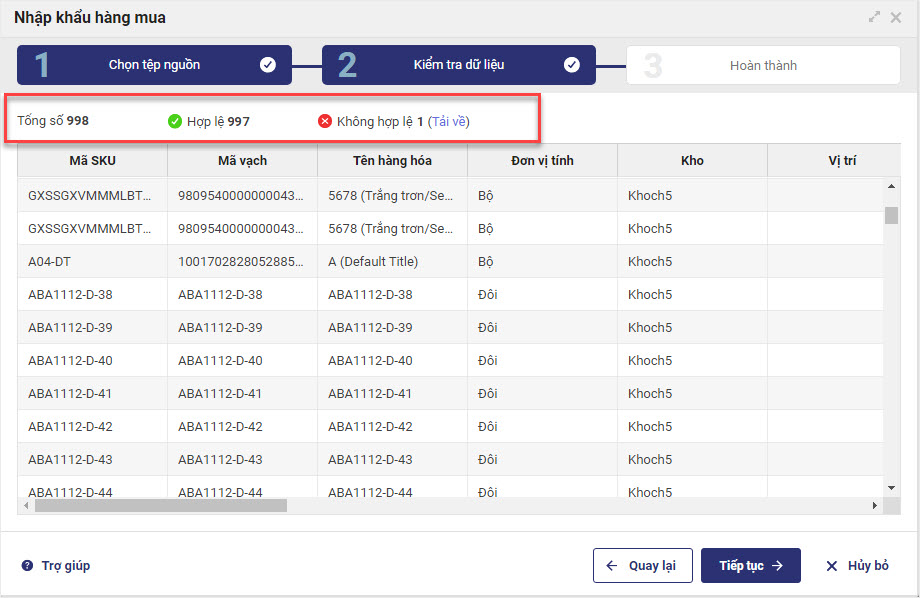 Khi nhập khẩu hàng hóa, tại bước Kiểm tra dữ liệu: