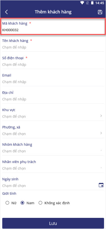 2. Khi thêm mới khách hàng, cho phép thu ngân nhập được mã khách hàng trên ứng dụng Mobile