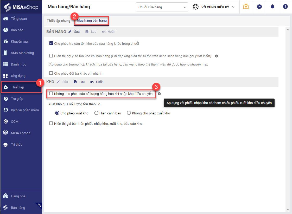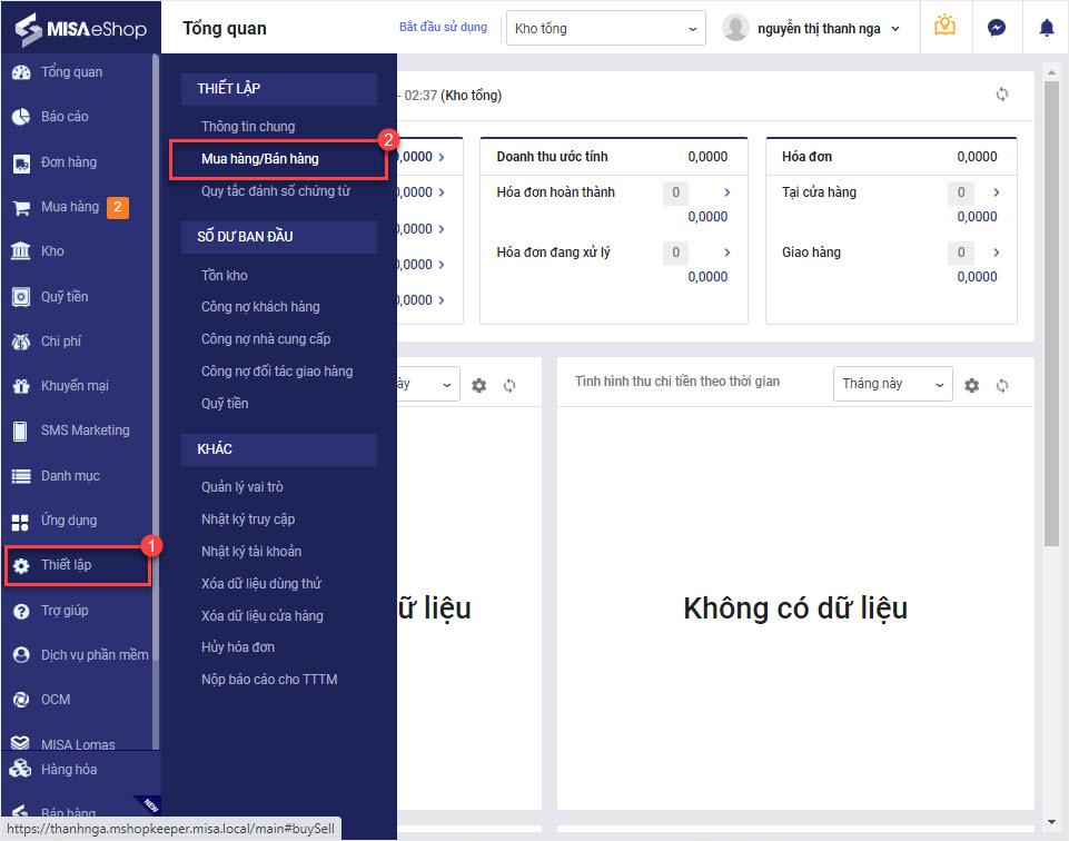 Bước 1: Trên trang quản lý, chọn Thiết lập /Mua hàng/Bán hàng