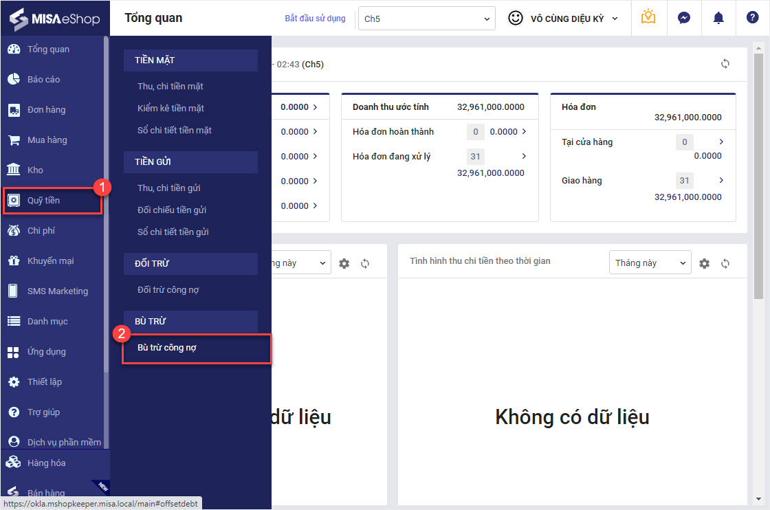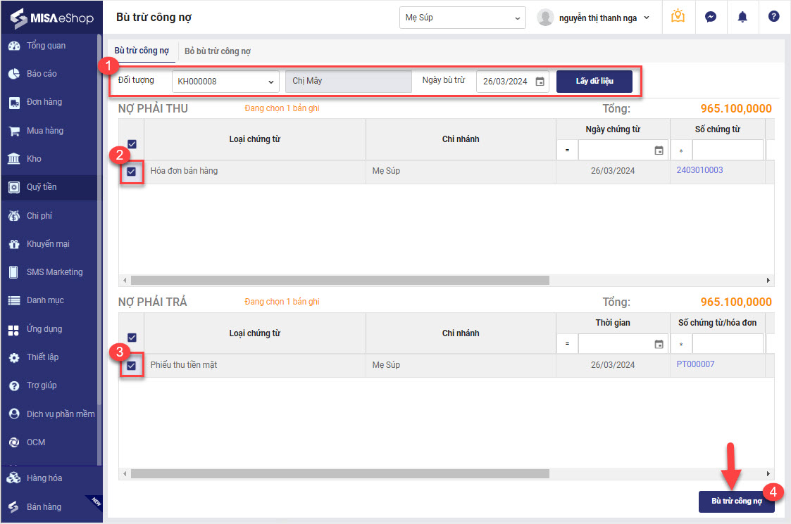 Bước 1: Vào phân hệ Quỹ tiền/Bù trừ và chọn Bù trừ chọn nợ
