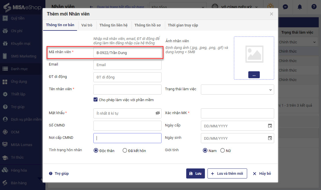- Tại form chi tiết, trường thông tin Mã cho phép người dùng có thể sử dụng dấu cách, ký tự có dấu và ký tự đặc biệt theo ý muốn.