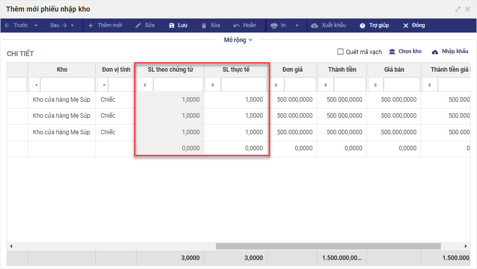 - Cột SL thực tế: Mặc định hiển thị bằng số lượng theo chứng từ và cho phép người dùng sửa lại SL cần nhập mới.