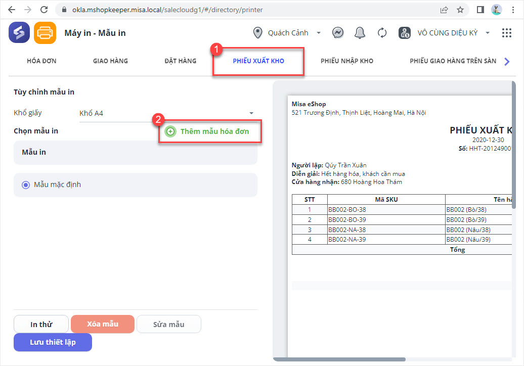 Nếu cửa hàng chưa thiết lập sẵn phiếu in xuất kho, nhấn Thêm mẫu in hóa đơn