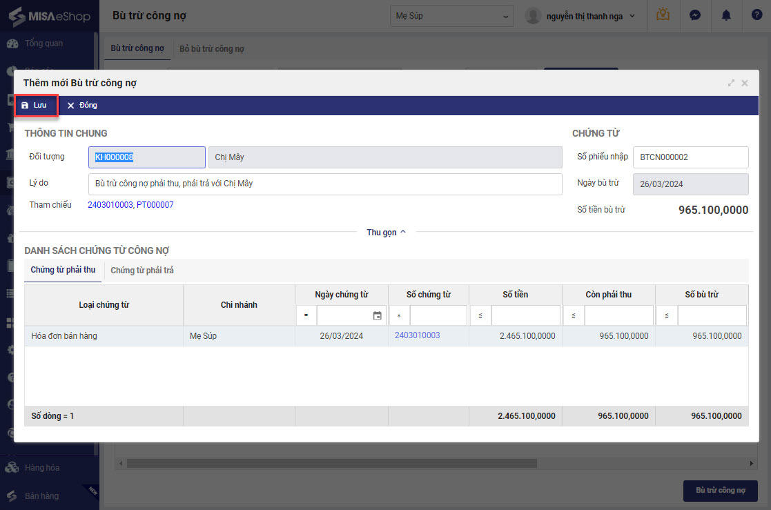Bước 6: Nhấn Lưu để lưu lại chứng từ bù trù công nợ.