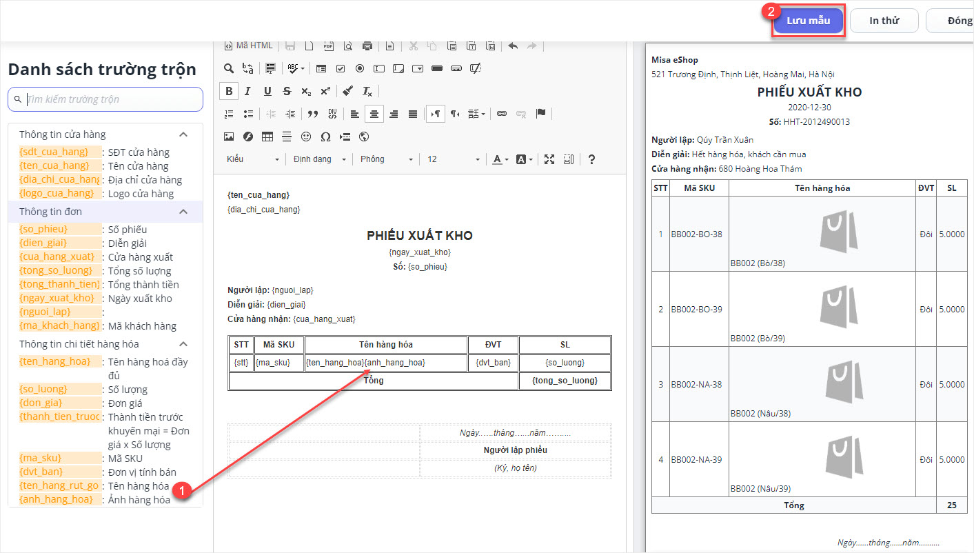 Bước 3: Tại mục Danh sách trường trộn, phần Thông tin chi tiết hàng hóa, chọn trường trộn {anh_hang_hoa}: Ảnh hàng hóa