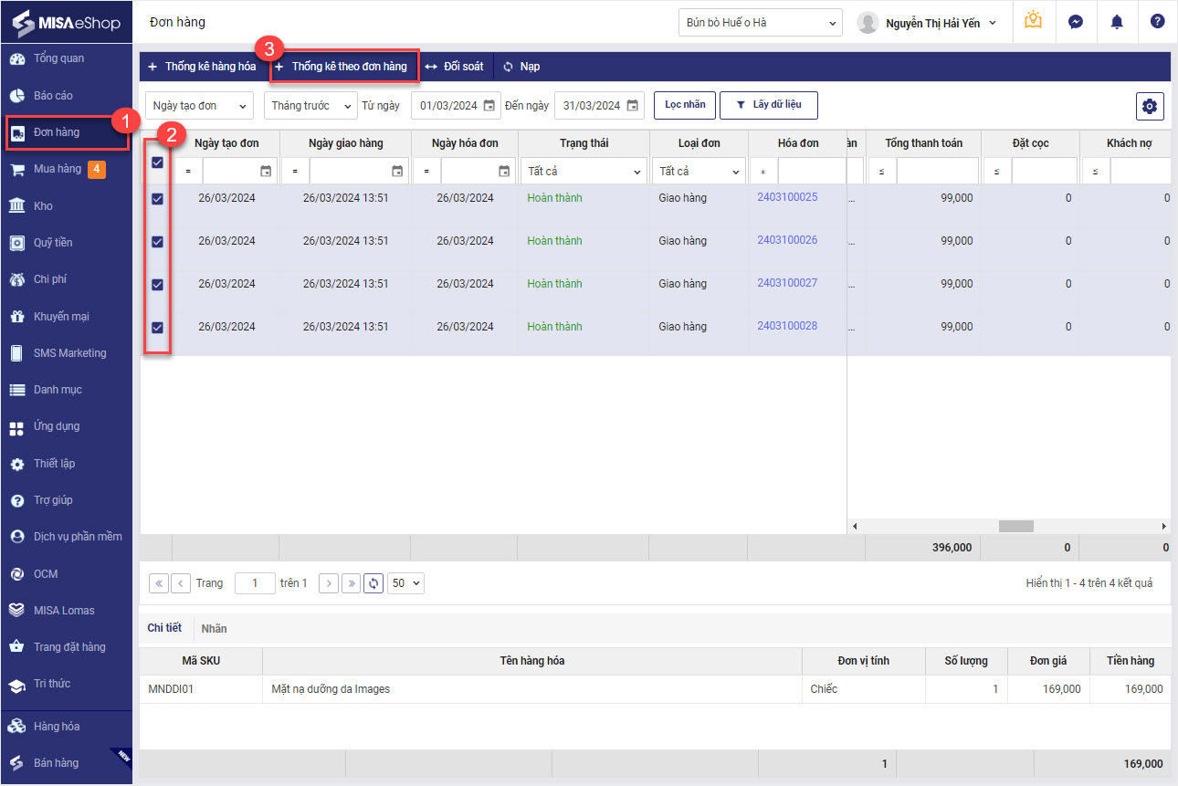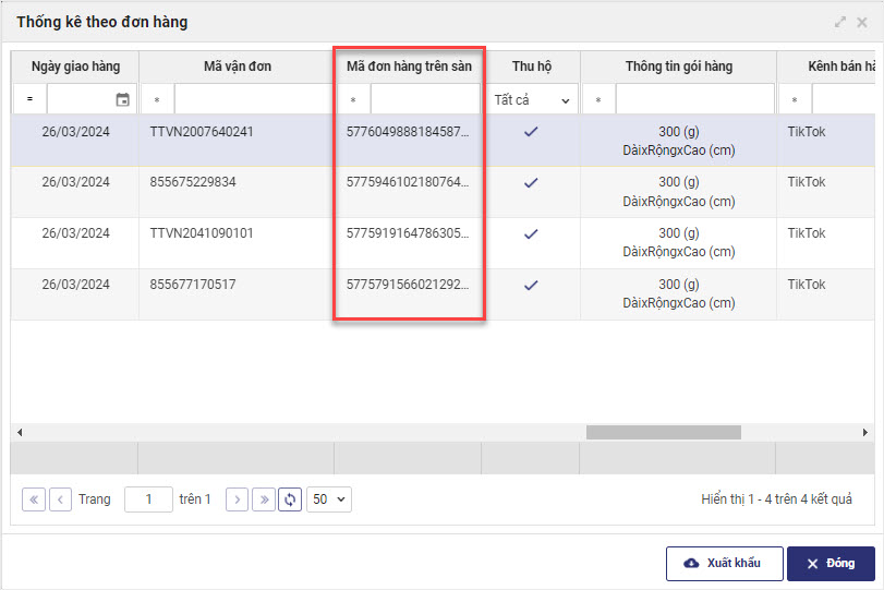 1. Trên trang quản lý, chọn Đơn hàng/Thống kê theo đơn hàng, chương trình bổ sung thêm trường thông tin Mã đơn hàng trên sàn