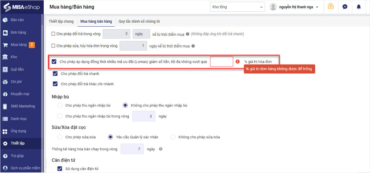 Tại tab Bán hàng, nhấn Sửa và tích chọn Cho phép áp dụng đồng thời nhiều mã ưu đãi (LOMAS) giảm số tiền, tối đa không vượt quá…% giá trị hóa đơn