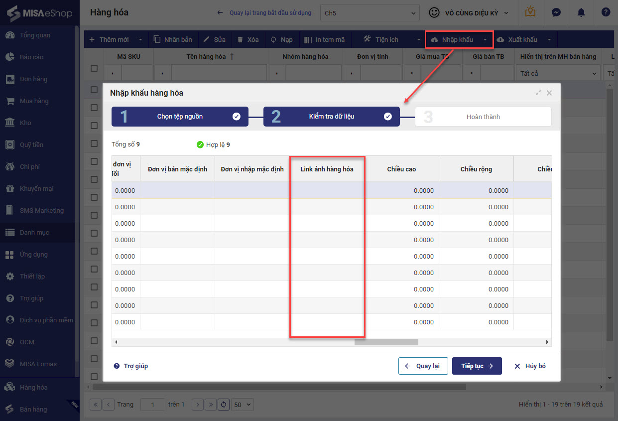 Ttên file Nhập khẩu hàng hóa, tại Bước kiểm tra dữ liệu, chương trình bổ sung thêm trường thông tin Link ảnh hàng hóa
