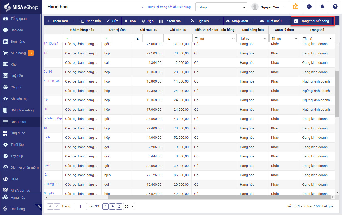 Trên phân hệ Danh mục/Hàng hóa, tích chọn Trạng thái hết hàng, cho phép người dùng chọn nhanh danh sách hàng hóa có số lượng tồn < 0 hoặc= 0