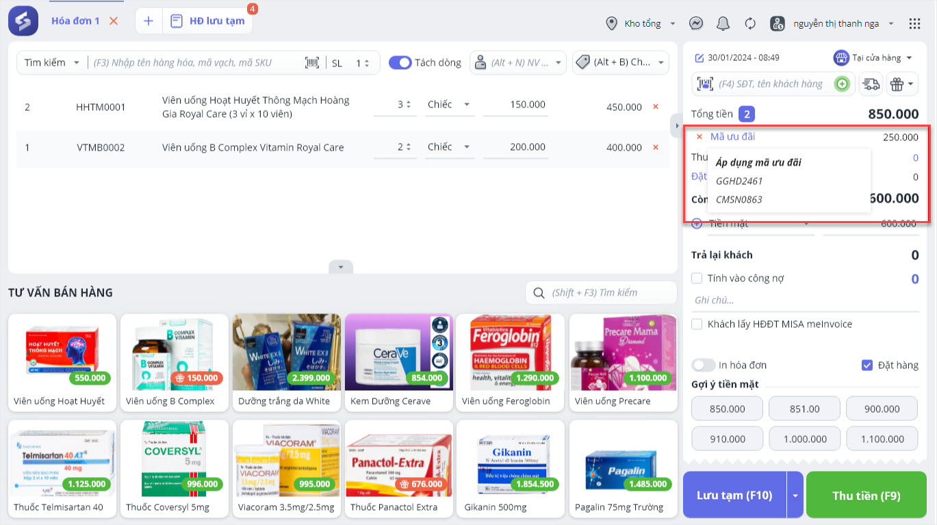 Khi áp dụng mã ưu đãi cho khách hàng, cho phép thu ngân chọn nhiều mã ưu đãi giảm giá số tiền của hóa đơn đảm bảo số tiền không vượt quá số % giá trị hóa đơn trong thiết lập.