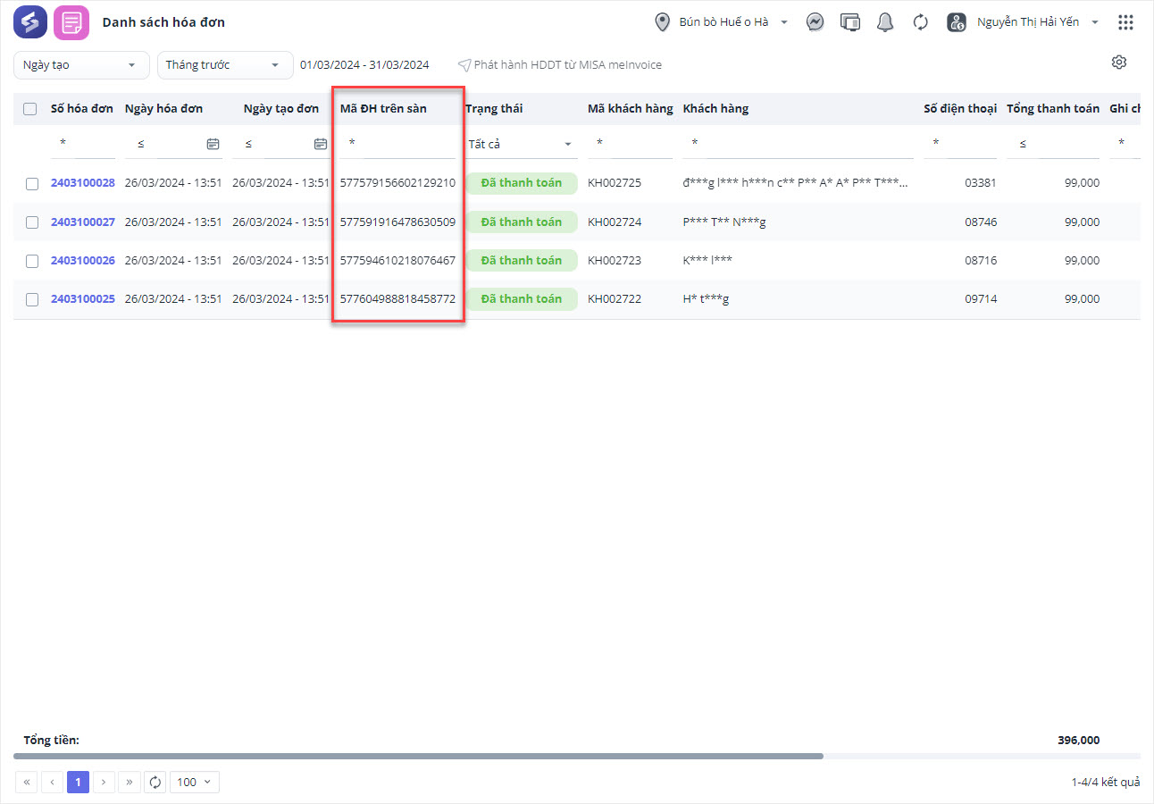 và chọn DS hóa đơn, chương trình bổ sung thêm trường thông tin Mã ĐH trên sàn