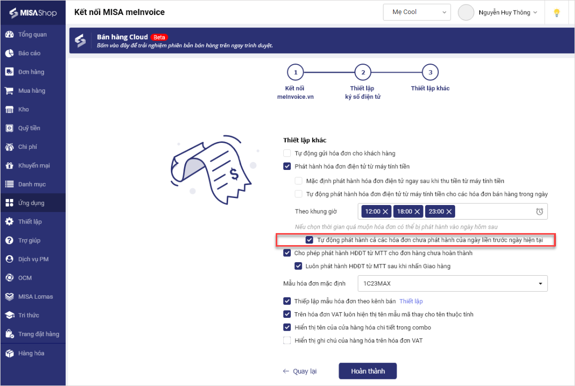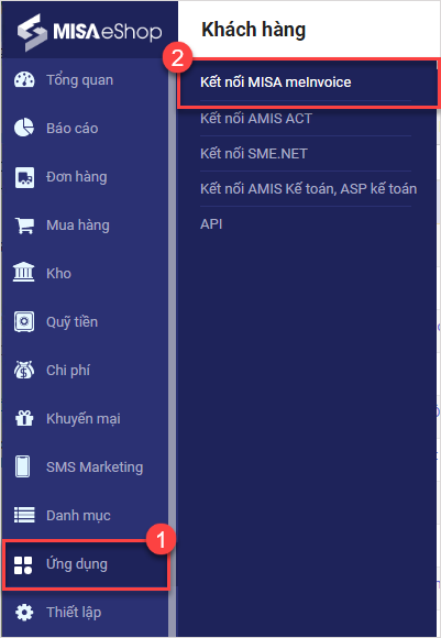 Trên trang quản lý, chọn Ứng dụng/Kết nối MISA MeInvoice/Thiết lập kết nối/Thiết lập khác