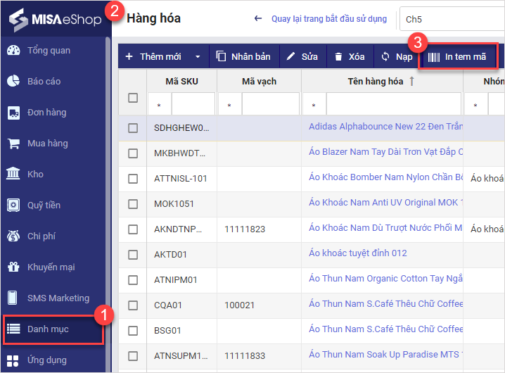 Trên trang quản lý, chọn Danh mục/Hàng hóa/In tem mã