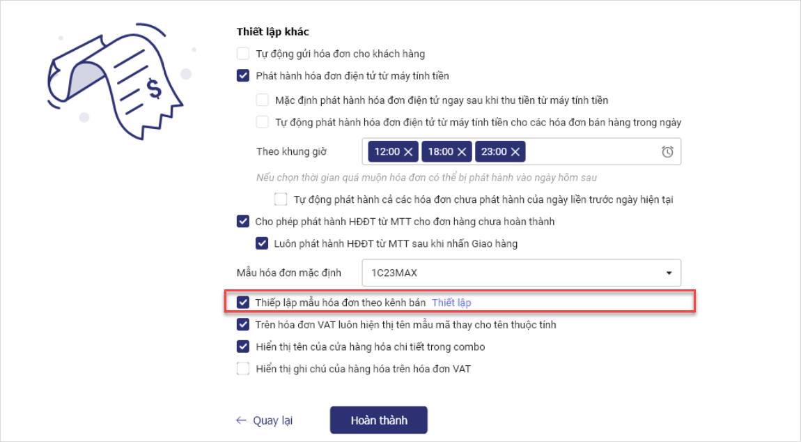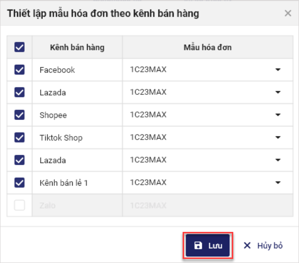 Nhấn Thiết lập để chọn mẫu hóa đơn tương ứng với từng kênh bán hàng
