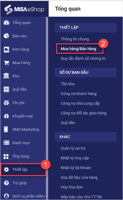 Trên trang quản lý, chọn Thiết lập/Mua hàng/Bán hàng