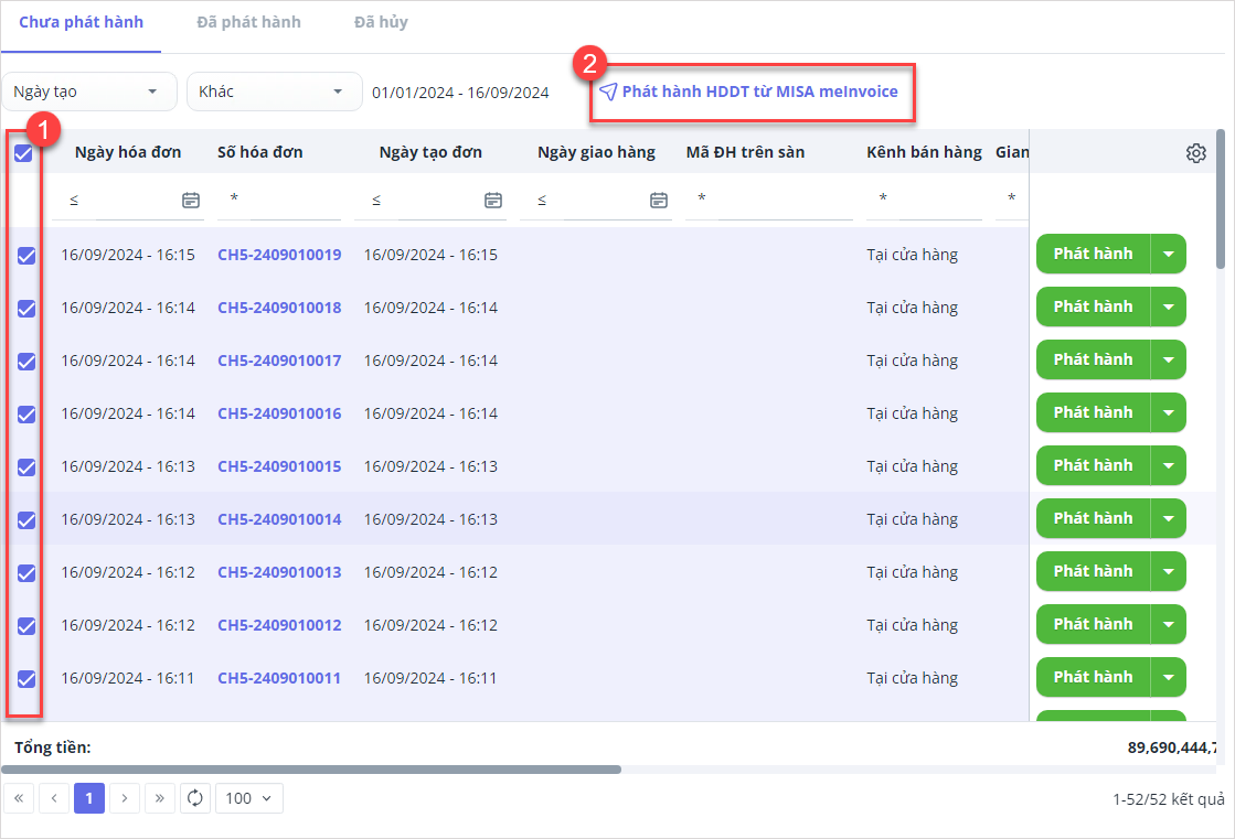 Bước 2: Chọn Tab Hóa đơn chưa phát hành. Tại đây, người dùng có thể chọn số lượng tối đa 100 hóa đơn cho mỗi lần phát hành để phát hành hàng loạt