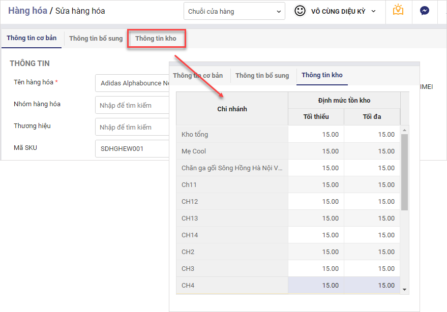Lúc này, hệ thống sẽ tự động áp dụng mức tồn kho tối thiểu/tối đa đã thiết lập tại mỗi chi nhánh