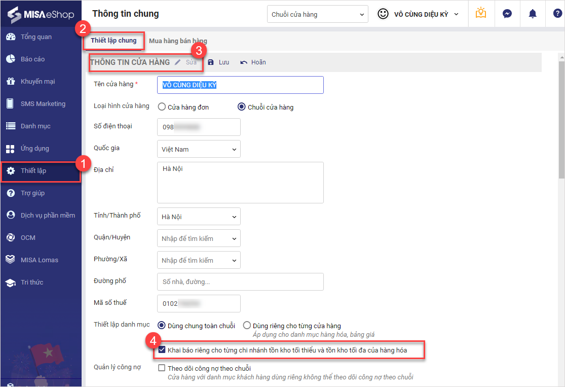 Bước 1: Trên trang quản lý, chọn Thiết lập/Thông tin chung, tại phần Thông tin cửa hàng, nhấn Sửa và tích chọn Khai báo riêng cho từng chi nhánh tồn kho tối thiểu và tồn kho tối đa của hàng hóa