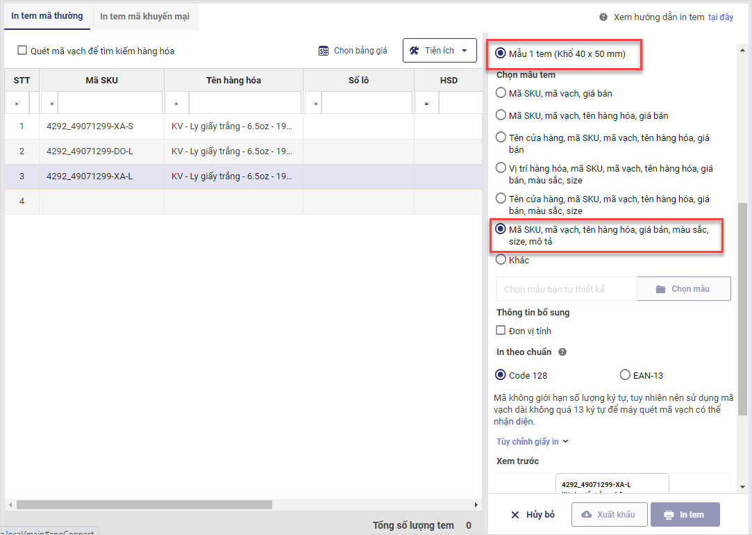 Sau khi chọn sản phẩm và mẫu tem, nhấn nút In Tem để bắt đầu quá trình in tem mã
