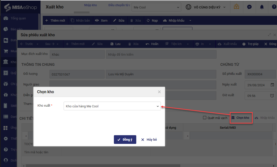 Tại giao diện chi tiết phiếu xuất kho, cho phép quản lý chọn lại kho xuất của từng dòng hàng hóa