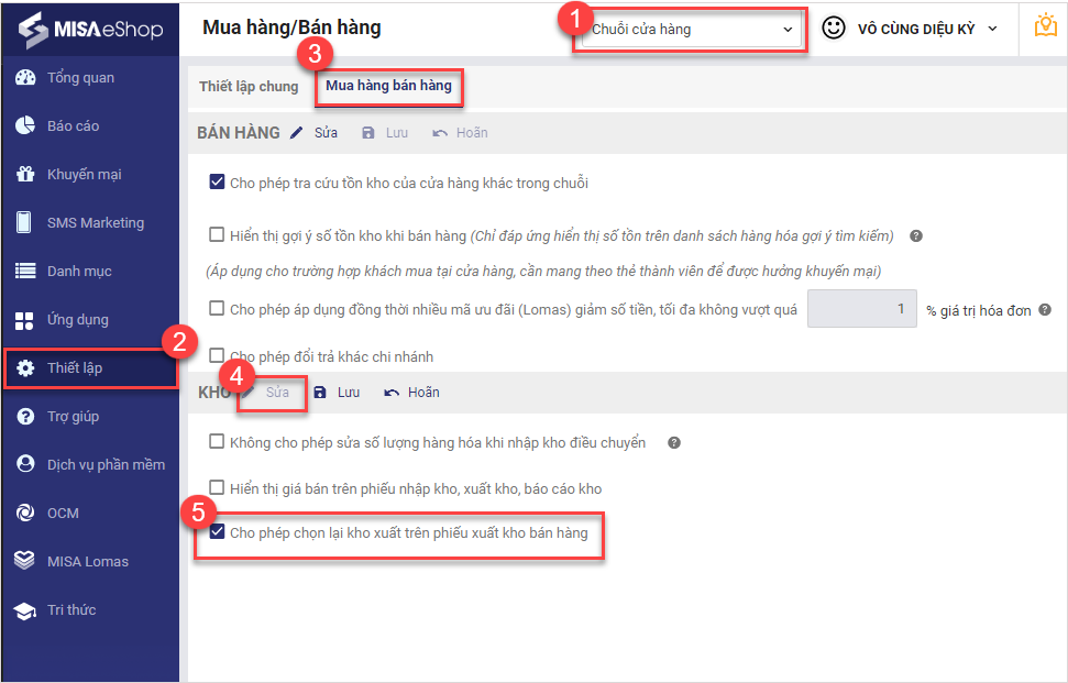 Tại phân hệ Kho, nhấn Sửa và tích chọn Cho phép chọn lại kho trên phiếu xuất kho bán hàng