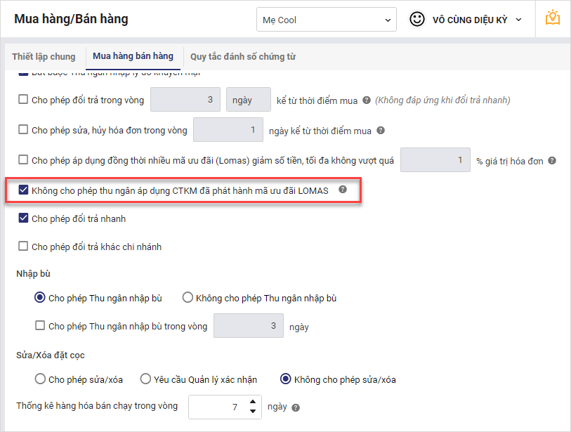 Tìm tới phân hệ Bán hàng, nhấn Sửa và tích chọn Không cho phép thu ngân áp dụng CTKM đã phát hành mã ưu đãi LOMAS