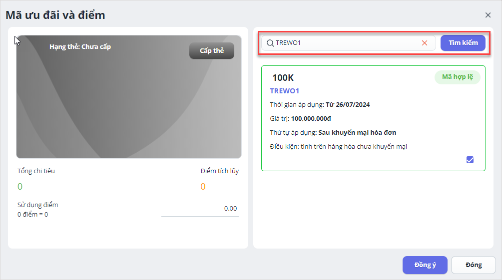 Để áp dụng CTKM, tại màn hình Mã ưu đãi và điểm, thu ngân cần nhập đúng số Mã ưu đãi hợp lệ của CTKM đã phát hành