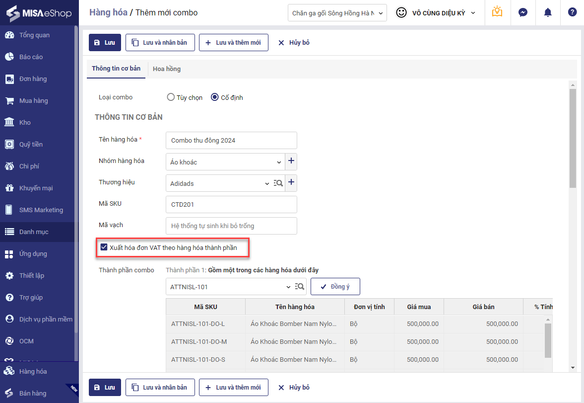 3.1. Trên trang quản lý, vào Danh mục/Hàng hóa, khi tạo mới hoặc chỉnh sửa hàng hóa Combo, hệ thống bổ sung thiết lập Xuất hóa đơn VAT theo hàng hóa thành phần, cho phép quản lý tích chọn tùy chỉnh này