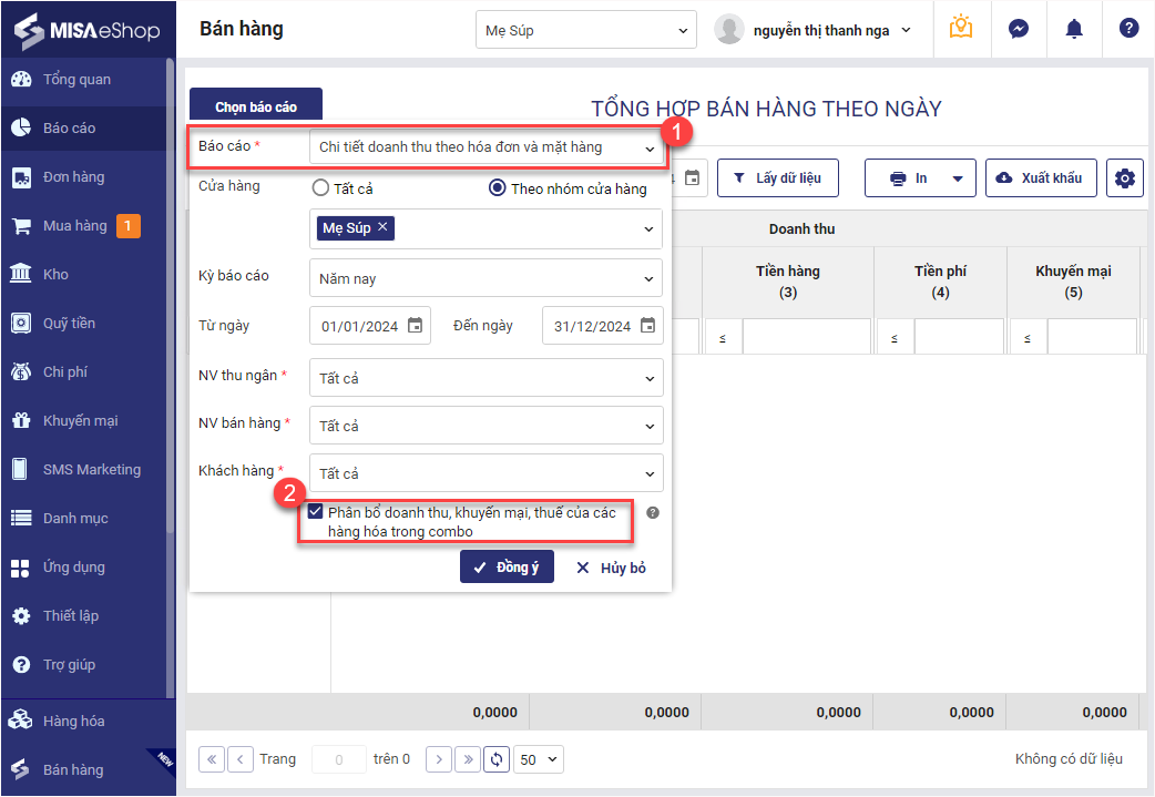 – Hệ thống bổ sung thêm tính năng Phân bổ doanh thu, khuyến mại, thuế của các hàng hóa trong combo, cho phép quản lý tích chọn khi xem theo tham số báo cáo